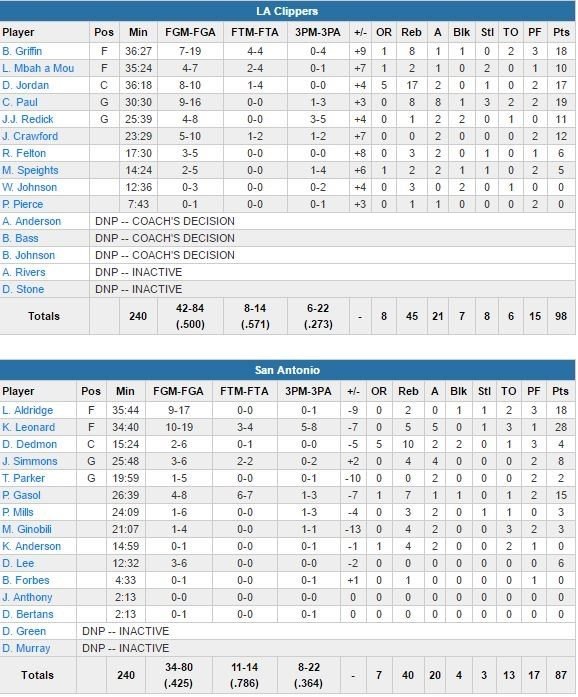 Kawhi Leonard termine à 28 points à 10/19, 5 rebonds et 5 passes, LaMarcus Aldridge 18 points à 9/17 et 2 rebonds et San Antonio (dominé 3-1 en saison par les Clippers), qui avait déjà sécurisé sa 2ème place à l’Ouest, perd pour la 10ème fois de la saison seulement à domicile. Aldridge domine le 1er quart-temps avec 10 points à 5/9 et permet à son équipe de mener d’un point après 12 minutes (23-22) mais les Clippers vont réagir en passant un 48-32 à leurs adversaires dans la peinture. Los Angeles mène 52-43 à la pause au terme d’un 30-20 dans le 2ème quart.