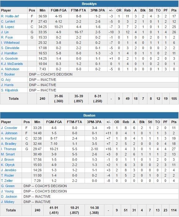 Al Horford ajoute 19 points et 8 rebonds pour les Celtics dans ce match dominé de jusqu’à 27 points dans le 3ème quart-temps avant un 18-5 des Nets pour revenir dans le match. Brooklyn reviendra à 6 points dans le dernier quart mais Thomas et Horford combinent pour 15 points dans la période et éteignent les espoirs de victoire adverses. Jeremy Lin termine à 26 points et 12 rebonds, Brook Lopez (devenu le meilleur scoreur de la franchise devant Buck Williams) 25 points.