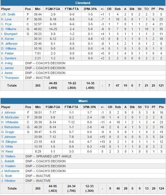 Deron Williams a battu son record en saison pour Cleveland (35 points, 9 passes et 7 rebonds mais aussi 10 ballons perdus) mais l’équipe (qui jouait aussi sans Tristan Thompson, blessé au pouce) compte désormais 0 victoire pour 7 défaites en l’absence de James. Malade et incertain avant le match, Kevin Love a finalement joué et termine à 25 points, Channing Frye suit avec 21 et Kyle Korver avec 18. L’équipe a gâché une avance de 10 points dan le dernier quart. Miami (29ème victoire sur ses 40 derniers matchs) a survécu en prolongation malgré deux actions à 4-points des Cavs, dont une de Williams à 34 secondes de la fin pour prendre 1 point d’avance.