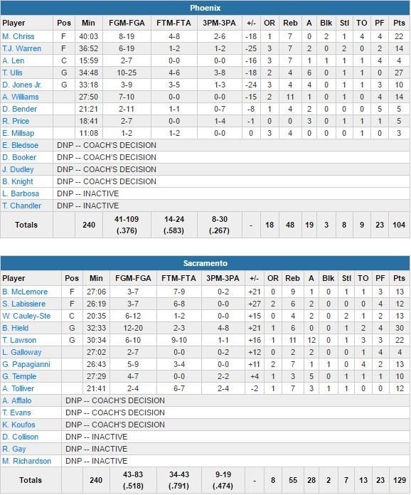 Avec un Buddy Hield (rookie du mois de mars) à 30 points à 12/20 et 6 rebonds et un Ty Lawson en triple-double pour la première fois de sa carrière (22 points à 6/10, 11 rebonds et 12 passes), les Kings sont venus à bout des Suns 129-104 cette nuit à Sacramento.