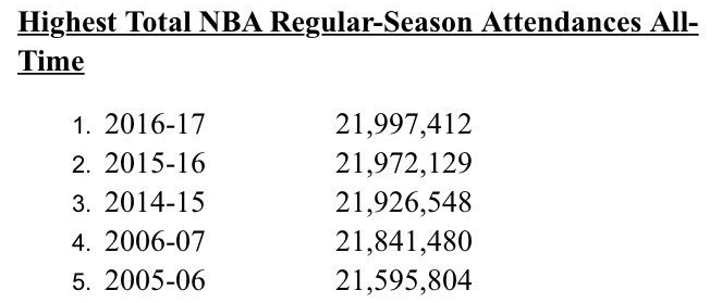 On le savait déjà mais la NBA ne s’est jamais aussi bien portée et n’a jamais attiré autant les foules. Pour la 3ème année consécutive elle vient de battre son record d’affluence sur la saison avec 21 997 412 fans qui ont assisté aux rencontres dans les 30 salles. Le record établi l’an passé était de 21 972 129.