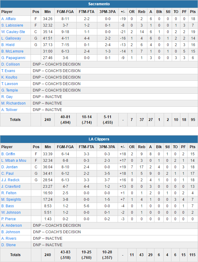 Après 7 premières minutes équilibrées, les Clippers ont pris les commandes pour ne plus jamais les lâcher, sans pour autant faire de véritable break puisque les Kings, également en réussite, sont restés à portée de tir. A la pause les locaux menaient 53-47 et sur un trois points de Langston Galloway après 4 minutes de jeu en seconde mi-temps, Sacramento est revenu à 2 points, 61-59. Mais ils ne reviendront pas plus près puisque les hommes de Doc Rivers ont répondu par un 11-2. Ils ont entamé les 12 dernières minutes avec un avantage 87-73 et ont tranquillement géré leur avance jusqu’au buzzer final.