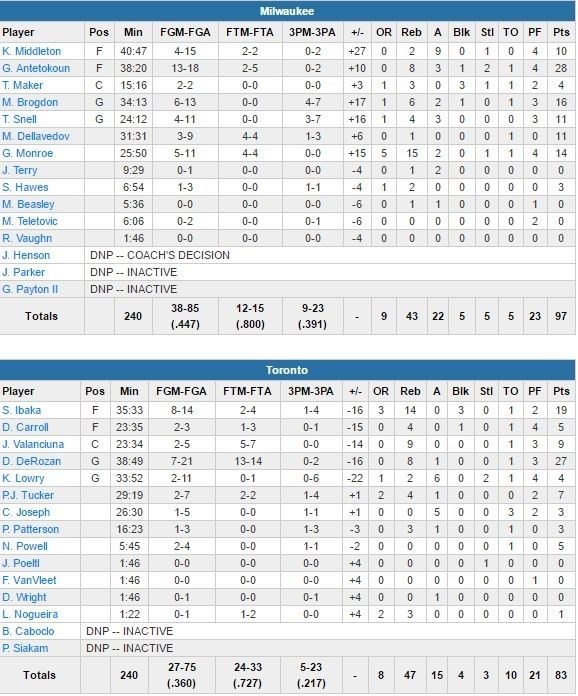 Greg Monroe ajoute 14 points et 15 rebonds, Tony Snell 11 points et Khris Middleton 10 points et 9 passes. DeMar DeRozan termine lui meilleur marqueur des Raptors avec 27 points (7/21, 8 rebonds), suivi par Serge Ibaka et ses 19 points et 14 rebonds (8/14, 3 contres). Kyle Lowry est lui passé complètement au travers avec 4 points à 2/11 et 0/6 à 3-points, 2 rebonds et 6 passes. Il est resté à l’Air Canada Centre après la rencontre pour une séance de shoots. Toronto (5/23 à 3-points contre 9/23) est mené 30-22 après 12 minutes de jeu mais passe un 29-16 à ses adversaires (7/21 dans le 2ème) dans le 2ème pour mener 51-46 à la pause. Ibaka et DeRozan inscrivent chacun 10 points dans la période, à 6/6 aux lancers-francs.