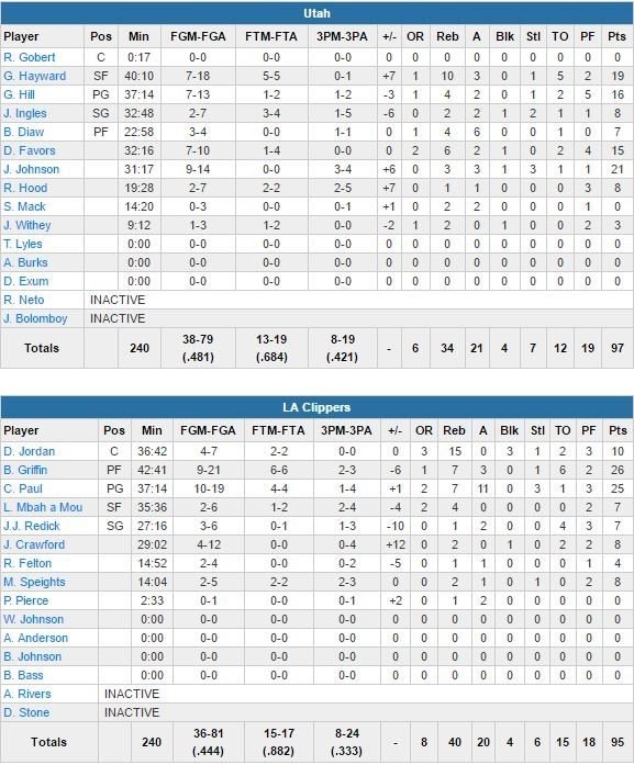 Hayward et Johnson au scoring, le Jazz a su se maintenir en tête dans le money time, 94-91. Mais suite à une perte de balle de Johnson, Griffin rentre 2 lancers-francs (faute de Hill) et les Clippers reviennent à 94-93 à 23 secondes de la fin. Après un temps-mort de Quin Snyder, Griffin fait faute sur Derrick Favors, qui rentre 1 lancer sur 2 pour le +2 du Jazz, 95-93, à 18 secondes de la fin. Suivront les paniers clutchs de Paul puis Johnson.