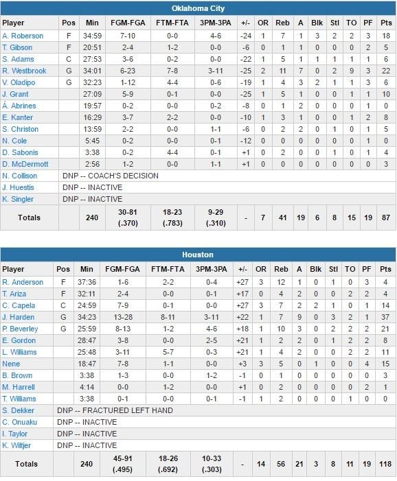 Oklahoma City aura tenu une mi-temps à Houston hier. À 5 longueurs (54-59) des Rockets à la mi-temps, Russell Westbrook (22 points à 6/23, 11 rebonds, 7 passes et 9 ballons perdus) et ses coéquipiers vont prendre un 59-33 (30-20 et 29-13 sur les 2 derniers quarts) en seconde mi-temps pour finalement s’incliner lourdement 118-87 face à James Harden (37 points à 13/28, 7 rebonds et 9 passes) & Co.