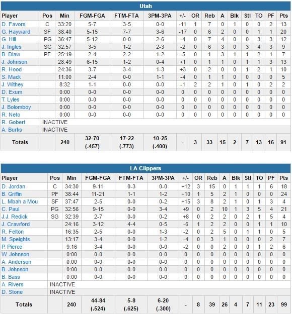En l’absence de Gobert, Utah s’est fait manger dans la peinture avec un déficit 60-38 aux points inscrits dans la raquette. Les Clippers vont prendre 12 points d’avance dans le 1er quart-temps (remporté 29-18) en mode Lob City puis ne gagneront aucun quart-temps suivant de plus de 4 points sans pour autant se faire rejoindre au score par le Jazz de Gordon Hayward (20 points à 5/15, 6 rebonds et 2 passes). Quatre joueurs terminent à 10 points pour Utah mais aucun ne passe la barre des 13 points (Derrick Favors, 13 points à 5/7 et 7 rebonds et Joe Johnson, 13 points à 6/15).