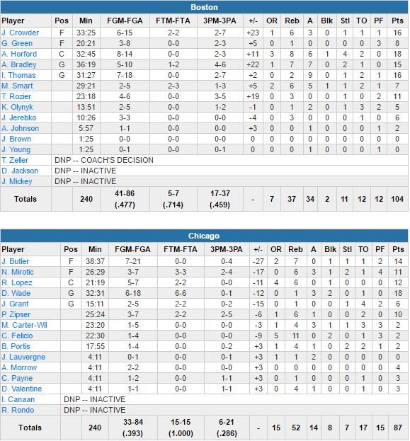 Boston a pris jusqu’à 20 points d’avance avant de voir les Bulls revenir à une unité (44-43) dans le 3ème quart-temps. Dwyane Wade termine meilleur marqueur pour Chicago avec 18 points (6/18, 3 passes et 2 contres), Jimmy Butler suit avec 14 points (7/21 et 7 rebonds) et le chef d’orchestre Rajon Rondo (fracture du pouce droit) a terriblement manqué à une attaque qui shoote à 39% (contre 47.7%) et perd 17 ballons (contre 12). Thomas score 8 points dans le 3ème quart-temps pour aider son équipe à reprendre le contrôle. Jae Crowder ajoute 16 points (6/15, 6 rebonds et 3 passes) sur le match et Avery Bradley 15 (5/10, 7 rebonds et 7 passes) dont 4 des 17 trois-points (17/37 contre 6/21 pour Chicago) de son équipe.