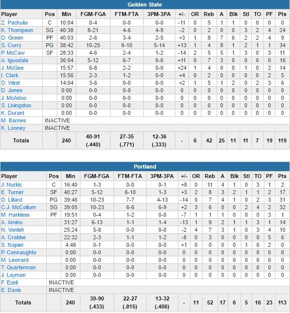 Impressionnants en 1ère mi-temps (67 points inscrits, 3ème plus gros total en 1ère mi-temps contre les Warriors cette saison en NBA), les Blazers n’ont pas réussi à tenir le tempo des Warriors de Stephen Curry (34 points à 10/25, 4 rebonds et 8 passes) sur les deux derniers quarts et se sont inclinés 119-113 au Moda Center cette nuit.