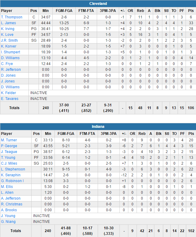 Alors que les Cavs multipliaient les actions individuelles sans succès (1 des 14 derniers tirs ratés), Indiana a raté pluisieurs bonnes positions , mais a fini par égaliser par Young à 2’30 du buzzer. Incapables de trouver le chemin du panier, les Cavs ont vu Indiana passer devant sur un nouveau panier de Young, 102-100 avec 91 secondes à jouer. LeBron est alors entré en scène avec un shoot à 3-pts et une interception. S’il a raté sa seconde tentative derrière l’arc, les Cavs ont pris le rebond offensif et Kyle Korver a porté l’écart à 3 points. La dernière séquence a été folle puisqu’Indiana a perdu le ballon mais Smith a tenté une passe dans le dos, perdue et récupérée par Paul George qui a balancé une brique.