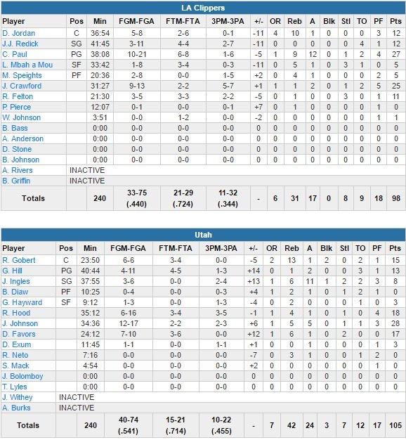 Dominateurs au rebond (42-31) et plus altruistes (24 passes à 17), les hommes de Quin Snyder ont bénéficié d’excellents apports en sortie de banc avec 28 points à 12/17, 5 rebonds et 5 passes de Joe Johnson, 18 points à 6/16 et 4 rebonds de Rodney Hood et 17 points à 7/10 et 6 rebonds de Derrick Favors. Joe Ingles signe lui 8 points à 3/6, 6 rebonds et 11 passes décisives. Johnson a inscrit 11 points d’affilée durant un run décisif dans le 4ème quart-temps, dont un pull-up à 3’55 pour passer devant 91-90 alors que l’équipe comptait 7 points de retard au début de la période. En tête quasiment tout le match, les Clippers (44% de réussite sur le match contre 54.1% pour Utah) ne repasseront plus une seule fois devant après ce panier.