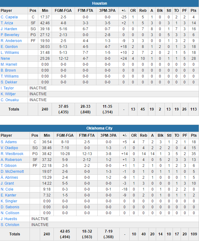 James Harden a connu un match très compliqué avec 16 points à 5/16, 7 rebonds, 8 passes et 7 passes ballons perdus, mais il a fait jouer ses coéquipiers et ils lui ont bien rendu. Nene est l’homme du match avec 28 points à 12/12 et 10 rebonds ! Eric Gordon et Lou Williams ajoutent 18 points chacun. En face Russell Westbrook a marqué l’histoire avec un nouveau triple-double qu’il a eu dès la mi-temps ! Il signe 35 points à 10/28, 14 rebonds et 14 passes mais n’a pas très bien géré son money time. Il devient seulement le second joueur de l’histoire à aligner 3 triple-doubles de suite en playoffs. Wilt Chamberlain détient le record avec 4. Il est devenu le premier de l’histoire à en aligner 3 avec au moins 30 points. Steven Adams signe 18 points et Victor Oladipo 15.
