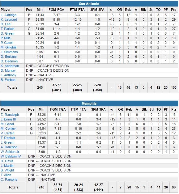Les 5 titulaires de Memphis terminent à au moins 10 points avec 26 points (7/18, 5 passes) pour Mike Conley, 18 (5/12, 5 rebonds et 6 passes) pour Marc Gasol, 13 points à 6/14 et 11 rebonds pour Zach Randolph et 12 points à 4/9 et 4 rebonds pour Vince Carter. Le match est passé par 16 égalités (dont 4 dans le dernier quart) et 9 changements d’avantage. Les Spurs prendront le contrôle du match après 3 lancers-francs de Conley pour donner 7 points d’avance à Memphis, 88-81, à 6’29 de la fin. L’équipe passe alors un 22-8 (dont un 8-0 pour Leonard) qui sera fatal aux locaux.