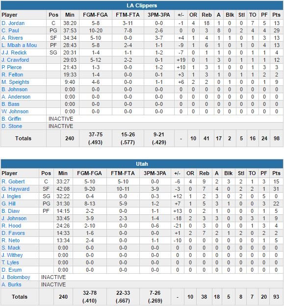Rudy Gobert termine à 15 points à 5/10, 9 rebonds, 2 passes, 3 contres et 2 interceptions, George Hill 22 points à 8/13, 5 rebonds et 3 passes. Joe Ingles est limité à 0 point à 0/4 en 32 minutes. En face Chris Paul mène la danse pour les Clippers (16 ballons perdus contre seulement 7 pour Utah) avec 29 points à 10/20 et 8 passes, accompagné par 3 joueurs à 13 points : DeAndre Jordan (5/8, 18 rebonds), Austin Rivers (5/10, 4 rebonds) et Luc Mbah a Moute (5/8, 6 rebonds).