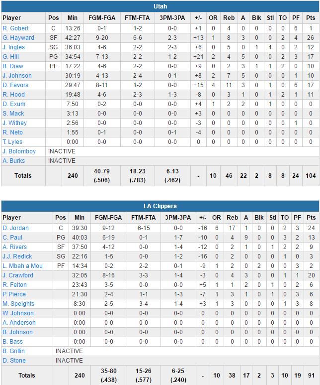 A peine revenu en jeu, Gobert a pris sa 3ème faute, encore très discutable, mais Utah a bien démarré le quart sous l’impulsion de Hood et grâce à une excellente défense. Menée par Joe Johnson et Derrick Favors, et avec une très bonne entrée de Dante Exum, la second unit du Jazz a fait le break, 37-28, puis le 5 a pris le relais, 41-30. Les Clippers étaient eux à la peine en attaque avec aucune circulation du ballon, de la maladresse et trop de ballons perdus. En fin de mi-temps Chris Paul et DeAndre Jordan ont tenté de limiter la casse et ont réussi à le faire puisque finalement les locaux ont viré derrière de 7 points, un moindre mal sachant qu’ils ont délivré seulement 7 passes (dont 3 dans les 2 dernières minutes) pour 8 ballons perdus.