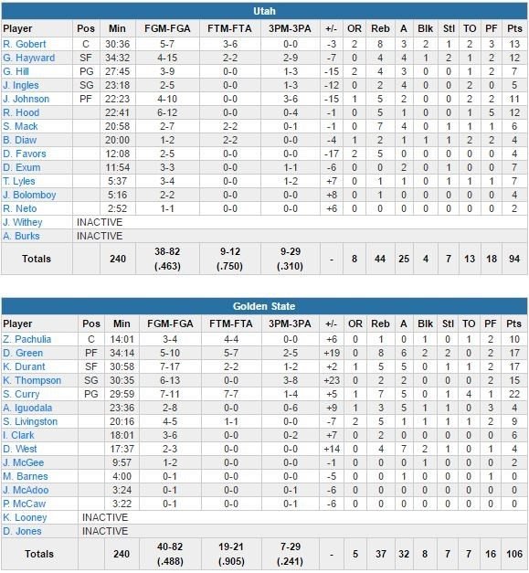Rudy Gobert termine meilleur marqueur du Jazz (dominé 32 passes à 24, 8 contres à 4 et 13 ballons perdus à 7) avec seulement 13 points à 5/7, 8 rebonds, 3 passes et 2 contres. Gordon Hayward a été limité à 12 points à 4/15, 4 rebonds et 4 passes.