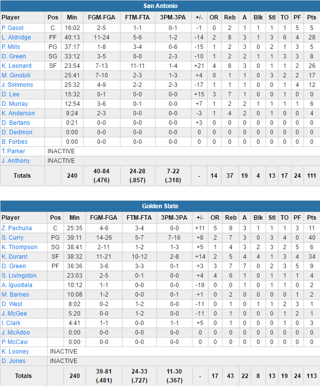 D’entrée de second mi-temps, Curry a allumé la mèche avec 3 3-pts de suite pour ramener l’écart à 15 points, mais les Spurs ont aussi aligné 3 3-pts par Aldridge, Leonard et Ginobili. Les Texans ont finalement repris 23 points d’avance mais le match a tourné, comme la cheville de Leonard. L’ailier s’est tordu deux fois la cheville coup sur coup et a dû abandonner ses coéquipiers. Curry s’est transformé en torche humaine, alimenté par les ballons perdus des Spurs. Ces derniers ont pris la foudre avec un 18-0 qui a ramené les locaux à seulement 5 points ! Finalement Ginobili a mis in à ce run et les Spurs, avec un bon Murray à la baguette ont plié sans rompre. Ils ont bien terminé le quart avec notamment deux derniers paniers signés Anderson pour entamer le dernier acte avec 9 points d’avance, 90-81 malgré 39 points des Warriors dont 19 de Curry dans le quart.