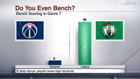 Si le meneur a craqué dans ce game 7 avec une seconde mi-temps catastrophique lors de laquelle il a signé 0 point à 0/11 lors des 19 dernières minutes, le banc a aussi été l’autre clé de la rencontre. En début de saison Marcin Gortat balançait que l’équipe possédait le pire banc de la NBA et malheureusement, si au fil des mois il a progressé avec notamment l’arrivée de Bogdanovic et Jennings, il était cette saison le gros point faible de l’équipe et ça a fini par coûter cher. Alors que côté Celtics Kelly Olynyk a été l’homme du match avec 26 points et que Marcus Smart, Jaylen Brown et Terry Rozier ont contribué au succès, côté Wizards, Bojan Bogdnaovic, Brandon Jennings, Jason Smith et Kelly Oubre Jr. n’ont pas fait le taf. Le Croate a inscrit les 5 points du banc, triste constat.