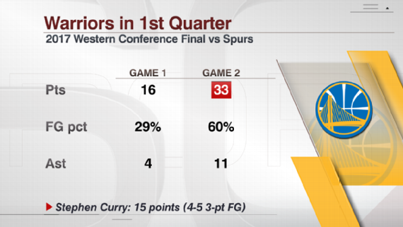Le meneur a inscrit 4 tirs à 3-pts dans les 12 premières minutes pour un total de 15 points alors que les Spurs shootaient à 6/26. Résultat les champions 2015 se sont retrouvés avec un matelas très confortable, 33-16.