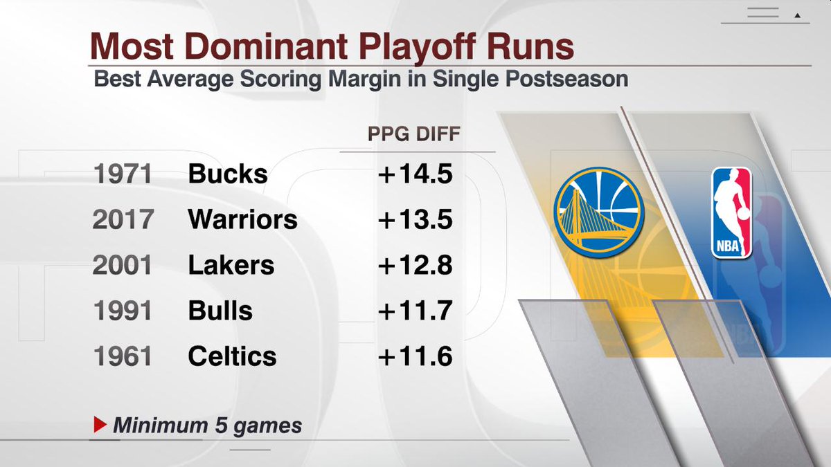 Les Warriors bouclent leurs playoffs avec un bilan de 16 victoires et 1 défaite, le meilleur de l’histoire devant le 15-1 des Lakers en 2001 et le 12-1 des Sixers en 1983. Ils ont remporté leurs matchs de 13.5 points en moyenne, la seconde de l’histoire derrière les +14.5 des Bucks en 1971.