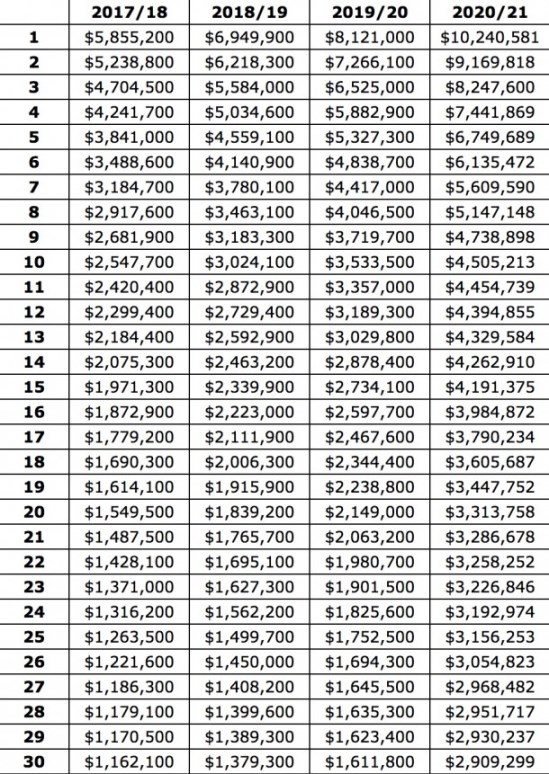 Voilà le salaire prévu pour les 30 premiers rookies draftés jeudi, à 120% du rookie scale