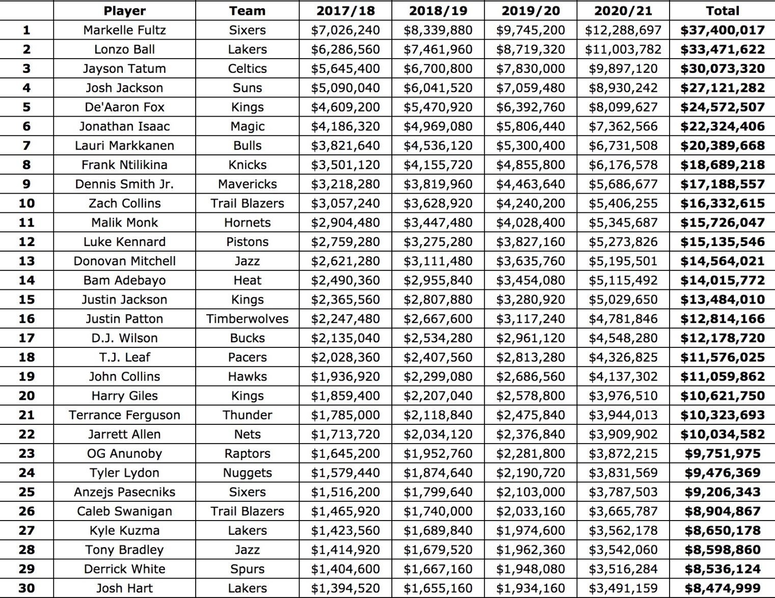 Ainsi, si le rookie scale pour le 1er choix indique un contrat avec un salaire pour la première année à 5.855 millions de dollars, Markelle Fultz devrait signer un contrat avec un salaire de 7.026 millions de dollars. Fultz paraphera un contrat de 37.4 millions de dollars sur 4 ans, contre 33.47 millions de dollars pour Lonzo Ball. Quant à Frank Ntilikina, il gagnera bien moins mais cela reste un excellent contrat avec 18.689 millions de dollars sur 4 saisons et un salaire de départ de 3.5 millions de dollars.