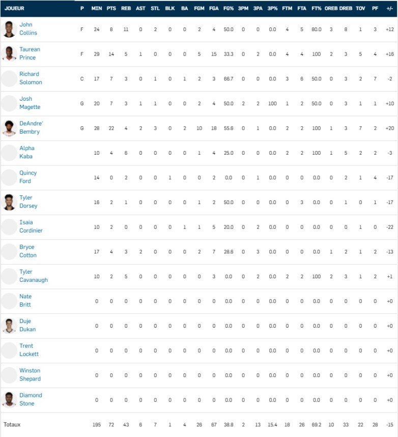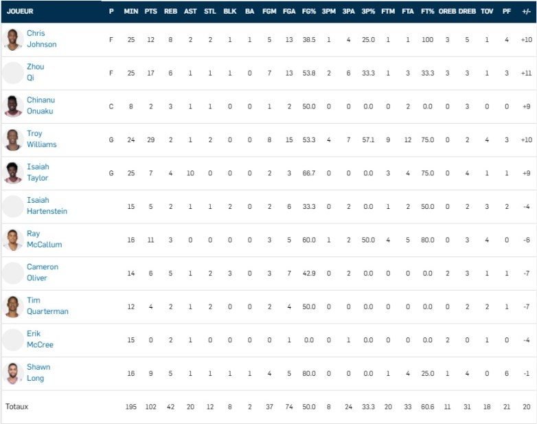 Côté Français, aucun n’a brillé : 7 points à 2/9, 4 rebonds et 2 passes pour Axel Toupane, 1 rebonds pour Vincent Poirier, 4 points à 1/4 et 6 rebonds pour Alpha Kaba et 2 points à 1/5 pour Isaia Cordinier, 5 points à 2/4 et 3 rebonds pour Petr Cornelie.