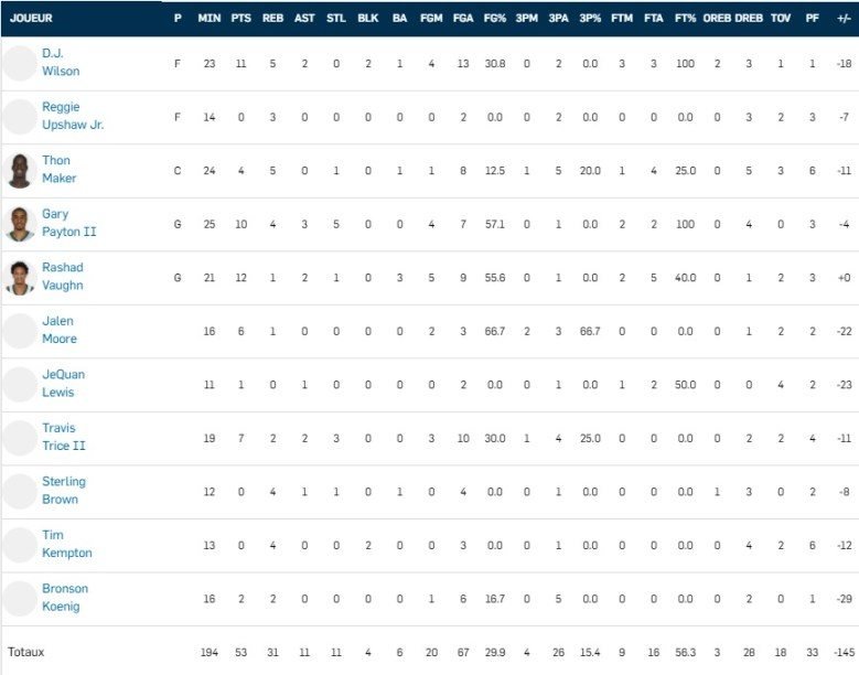 Des joueurs plus expérimentés ont brillé comme Brandon Ingram (26 points à 9/17), Pascal Siakam (24 points à 10/14), Cheick Diallo (27 points, 10 rebonds), DeAndre’ Bembry (22 points à 10/18), Malik Beasley (29 points à 12/30 et 6 rebonds) et Juancho Hernangomez (21 points à 6/15, 8 rebonds et 2 passes).