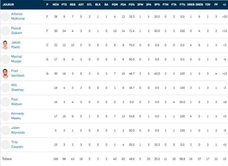 Côté Français, aucun n’a brillé : 7 points à 2/9, 4 rebonds et 2 passes pour Axel Toupane, 1 rebonds pour Vincent Poirier, 4 points à 1/4 et 6 rebonds pour Alpha Kaba et 2 points à 1/5 pour Isaia Cordinier, 5 points à 2/4 et 3 rebonds pour Petr Cornelie.