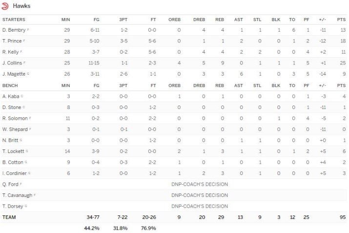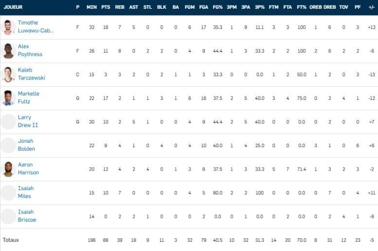 Alpha Kaba et Isaïa Cordinier ont pu rentrer sur le terrain pour Atlanta, les Français signent respectivement 4 points à 2/2 et 1 rebond en 3 minutes et 3 points à 1/2, 3 rebonds et 1 interception en 6 minutes.