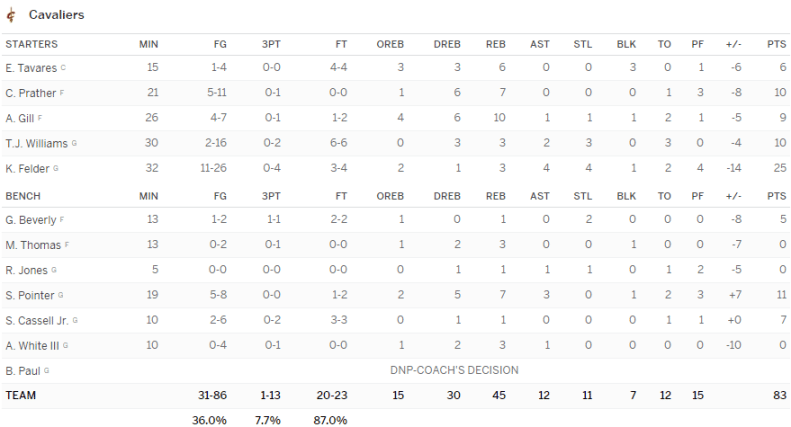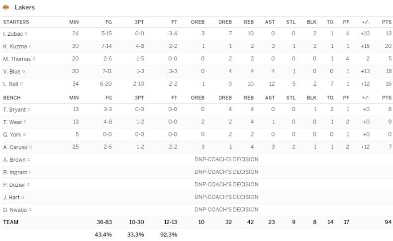 Les Lakers, menés par le nouveau triple-double de Lonzo Ball (16 points à 6/20 dont 2/10 à 3-pts, 10 rebonds, 12 passes, 5 interceptions, 2 contres et 7 ballons perdus) et les 20 points à 7/14 dont 4/8 à 3-pts de Kyle Kuzma, ont dominé les Cavs malgré les 25 points de Kay Felder