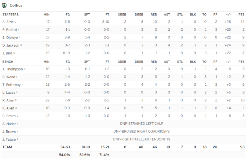 Les Celtics ont écrasé les Warriors 93-69 avec 14 points et 10 rebonds d’Ante Zizic, 17 points de Jabari Bird et 18 de Kadeem Allen.