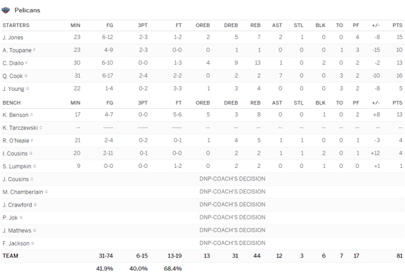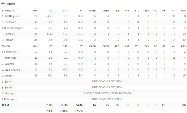 Les Spurs disposent des Pelicans avec encore un gros match de Bryn Forbes : 29 points à 8/22. Livio Jean-Charles prend 2 rebonds.