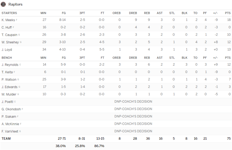 Parmi les grosses performances on notera les 35 points à 12/20 dont 8/11 à 3-pts, 7 rebonds et 3 interceptions du Warrior Dylan Ennis. Justin Jackson brille encore avec les Kings puisqu’il signe 29 points à 9/22. Brady Heslip plante 28 points à 8/15 à 3-pts pour les Bulls alors que Mike James signe un nouveau gros match avec 25 points à 9/19, 6 rebonds et 4 passes.