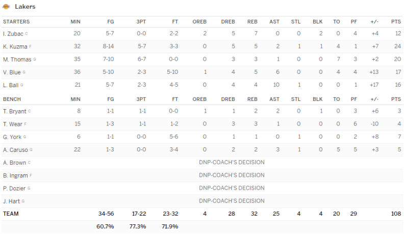 Ils maximisent très bien le jeu de Ball, avec un jeu rapide, ça gambade de partout, grosse projection vers l'avant, ça arrose à 3pts. Je trouve même qu'ils défendent mieux que les Lakers 16-17. Caruso est un vrai petit diable!