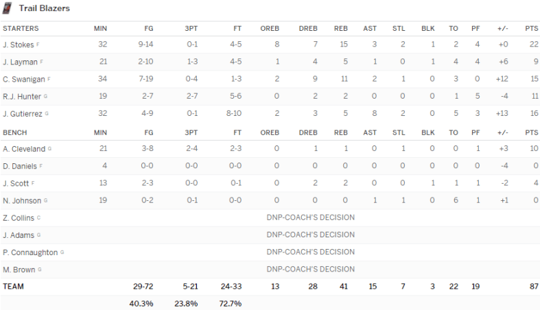 Les Blazers ont eux été menés par les 22 points à 9/14 et 15 rebonds de Jarnell Stokes et les 16 points et 8 passes de Jorge Gutierrez