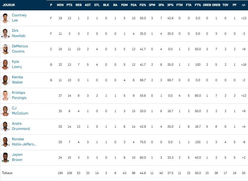 Côté Team World Lowry compile 13 points, 7 rebonds, 5 passes et 4 interceptions. Andre Drummond et Kristaps Porzingis signent 14 points chacun, Jaylen Brown ajoute 15 points et DeMarcus Cousins 11 points et 10 rebonds.