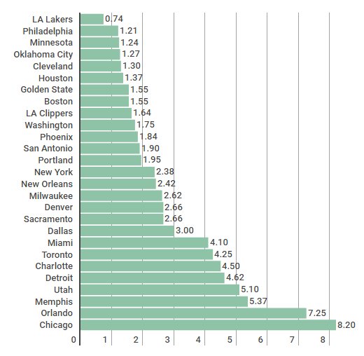 L’effet Lonzo Ball est assez impressionnant puisque si on prend en compte le ration victoires/diffusion sur la TV nationale, les Lakers ont de loin le plus faible