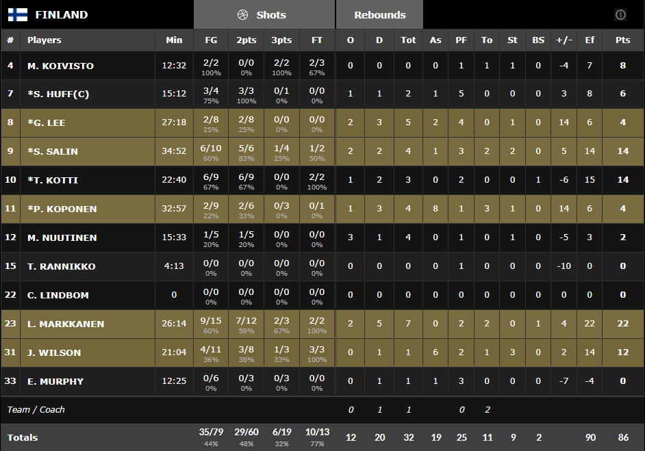 D’entrée Boris Diaw a commis une faite antisportive qui a permis à la Finlande d’entamer la prolongation en tête de 3 points. Evan Fournier a pris ses responsabilités avec 4 points de suite mais MArkkanen a lui aussi brillé et à 2 minutes de la fin la Finlande menait 79-76. Les deux équipes ont échangé les paniers mais à 1’30 de la fin la Finlande était toujours devant 81-79. Markkanen, héros du match, a planté un 3-pts assassin qui a mis deux possession d’écart avec 75 secondes à jouer. Boris a réduit l’écart sur la possession suivante et les bleus ont poussé la Finlande à une violation des 24 secondes. Dans la foulée Evan Fournier a balancé en 1ère intention à 3-pts pour égaliser à 25 secondes du buzzer. Derrière en un-contre-un Jamar Wilson a pris le dessus sur Westermann pour offrir la victoire aux locaux puisque Nando a échoué derrière l’arc au buzzer.