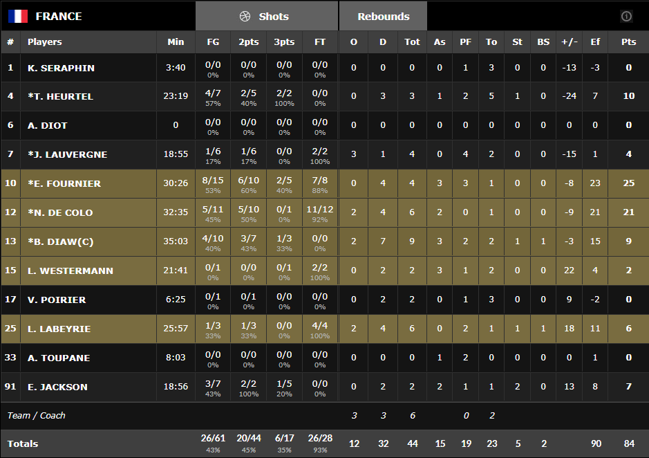 Il a clairement manqué de circulation du ballon, si excellente sur la prépa, tandis que la défense du 5 majeur a été catastrophique en premier et troisième quarts. L’équipe perd pas moins de 23 ballons sur la rencontre, au moins deux fois trop. Beaucoup de joueurs sont passés à côté ou ont été transparents comme Thomas Heurtel, Joffrey Lauvergne, Kevin Séraphin ou encore Vincent Poirier.