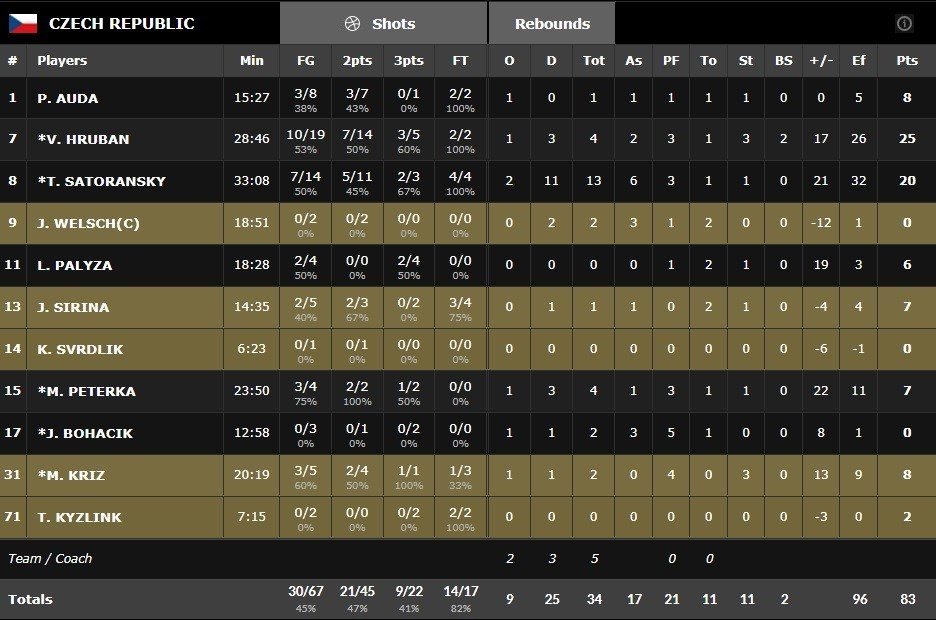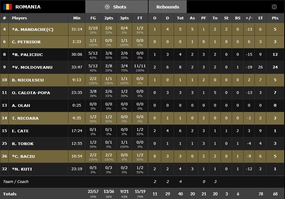 La Roumanie a craqué au retour des vestiaires en encaissant un cinglant 22-9 dans le 3ème acte, la faute notamment à Vojtech Hruban, auteur d’un gros quart. Pourtant en première mi-temps grâce à un excellent Moldoveanu (24 points et 8 rebonds) ils se sont accrochés, devant d’un point après 10 minutes et à seulement 2 points à la pause. Leurs gros soucis offensifs après la pause leur ont coûtés la rencontre, l’écart montant à 18 points en tout début de dernier quart. S’il y a eu un petit run qui a brièvement donné espoir aux locaux, les Tchèques ont parfaitement géré leur affaire.