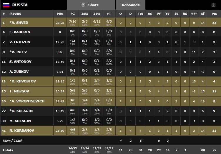 Après une première mi-temps très équilibrée, qui a vu la Russie virer en tête avec 2 petits points d’avance, 40-38, la première différence s’est faite en fin de 3ème quart avec 2 3-pts coup sur coup de Kulagin et Fridzon qui ont donné un avantage de 6 points à la Russie avant les 10 dernières minutes (57-51). Mais la Serbie a recollé en entamant très bien le dernier acte par un 9-2 dans le sillage de Marjanovic et Lucic. Mozgov fait un très bon passage avec 6 points de suite, qui a finalement fait la différence. Derrière Shved a pris les choses en main pour permettre à la Russie de résister tant bien que mal à la tentative de retour. Et les Serbes ont presque réussi à revenir puisqu’après un gros shoot à 3-pts de Bogdanovic, ils n’étaient plus qu’à 4 points à 76 secondes du buzzer. La Russie a plié mais sans rompre.