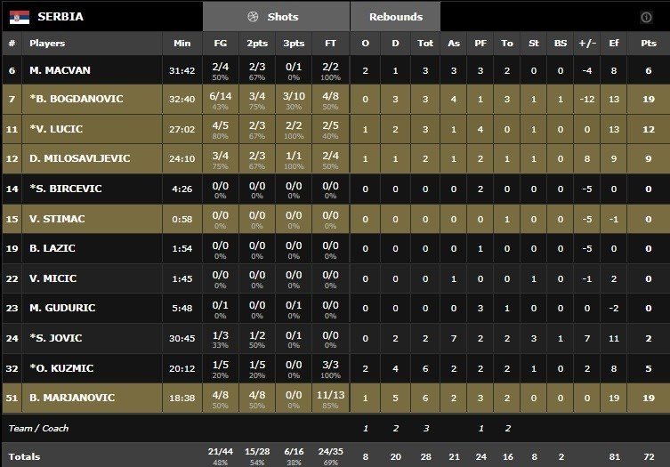 Quel début d’Eurobasket pour la Russie, dont l’équipe était une énigme, et qui a montré en deux rencontres qu’il allait falloir compter sur elle. Après l’hôte turc, elle s’est payée la Serbie dans un match encore très serré, 75-72. Encore une fois Alexey Shved a sorti un très bon match avec 22 points à 7/16 dont 4/11 à 3-pts et 4 passes, dont un shoot à 3-pts très important dans le money time.