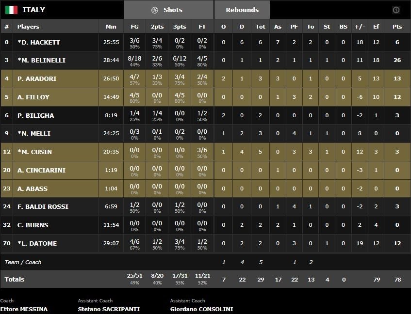 Le début de match a été compliqué pour les deux équipes, même si l’Italie a pris les devants 9-8 après 4 minutes de jeu en ne perdant qu’un ballon. C’est pourtant l’Ukraine (qui aura pris jusqu’à 5 points d’avance dans le match, contre 17 pour l’Italie) menée par Viacheslav Kravtsov qui s’est retrouvée en tête (19-16) à la fin du 1er quat-temps en shootant à 60%. Marco Belinelli a ensuite repris les choses en main en enchaînant les tirs à 3-points pour donner 8 points d’avance aux siens en fin de 1ère mi-temps, 37-29. Grâce à lui et Daniel Hackett (4 points, 5 passes et 3 rebonds à la mi-temps), les Italiens ont réussi à creuser un écart de 10 points à la pause, 43-33.