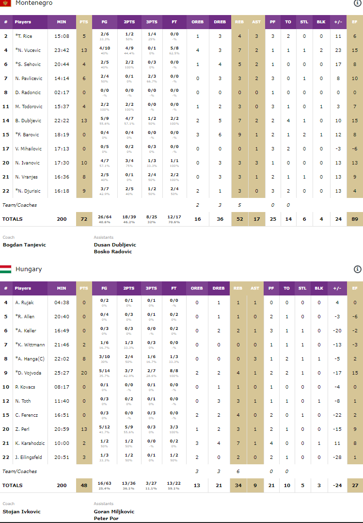 Djurisic et Vucevic ont très rapidement mis le Monténégro aux commandes avec un 10-3 et si la Hongrie a tenté de résister, les coéquipiers de l’intérieur du Magic ont mené de bout en bout. Ils ont fait le break en second quart sous l’impulsion de Vojvoda et Vucevic pour prendre 12 points d’avance, la Hongrie ayant du mal en défense. A la pause tout était encore possible avec un score de 39-29 mais la Hongrie a définitivement craqué au retour des vestiaires, sans scoreur et limitée à 11 points sur le quart. Le Monténégro s’est envolé pour compter 20 points d’avance 60-40. Ils ont ensuite déroulé en dernier quart.