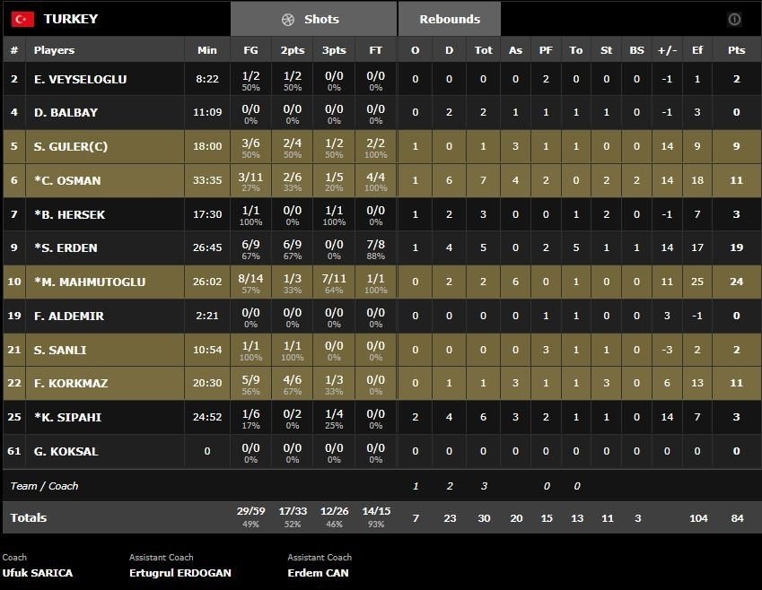 Malgré l’impressionnante réussite à 3-points de Melih Mahmutoglu, les Britanniques (dominés 30-18 aux points inscrits dans la peinture et 18 à 13 au nombre de ballons perdus) sont parvenus à réduire l’écart à moins de 10 points avant un énorme dunk signé Furkan Korkmaz pour conclure le 3ème quart-temps sur un +10 côté turc, 64-54. Au vu de l’adresse extérieure des deux équipes dans ce match, même en tête 75-68 à 2’54, la Turquie n’était pas encore à l’abri de quelques missiles longues distances adverses mais a tout de même tenu son avance jusqu’au bout, Mahmutoglu mettant définitivement fin au suspense sur un 3-points pour le +14.