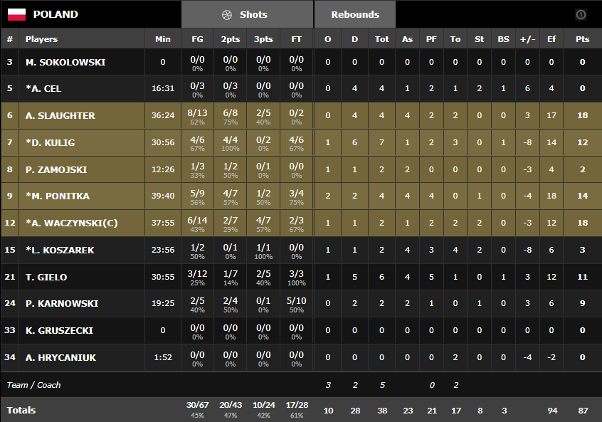 La Finlande avait pris un excellent départ, profitant surtout de la très mauvaise entame des Polonais, limités à 8 points lors des 10 premières minutes pour un retard de 10 points, qui est même passé à 14 unités après des 3-pts de Markkanen et Koivisto. La Pologne n’a pas paniqué et a terminé la mi-temps par un 10-0 pou recoller à seulement 4 points (36-22). Les Finlandais ont continué de faire la course en tête en début de seconde mi-temps mais sur un 9-0 en fin de 3ème les Polonais sont revenus à égalité avant le dernier acte. Sur leur lancée les Polonais se sont installés aux commandes du match et grâce à AJ Slaughter et Karnowski ont même fait un mini-break 63-57 à 2’30 du buzzer puis 66-57 après un 3-pts de Ponitka à 93 secondes du buzzer. On pensait le match plié mais la Finlande a réussi un miracle avec un lancer de Koponen, un 3-pts de Salin puis trois lancers de Markkanen qui les ont mis à 2 points à 15 secondes de la fin. Sur la dernière possession, Markkanen a intercepté pour aller planter le dunk synonyme de la prolongation.