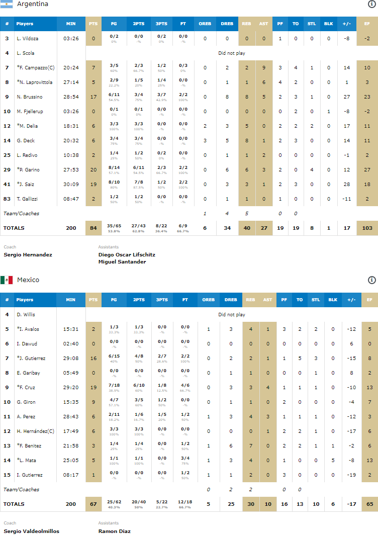 En l’absence de Luis Scola, blessé, et qui ne jouera pas la finale, c’est le trio Patricio Garino (20 points à 8/14, 6 rebonds et 3 passes), Nicolas Brussino (17 points à 6/11, 8 rebonds et 5 passes) et Javier Saiz (19 points à 8/10) qui a mené l’albiceleste. La rencontre a basculé lors d’un run en fin de troisième quart alors que le score était de 47-45. Les locaux ont passé une 13-4, qui est même devenu un 19-7 en début de dernier quart.
