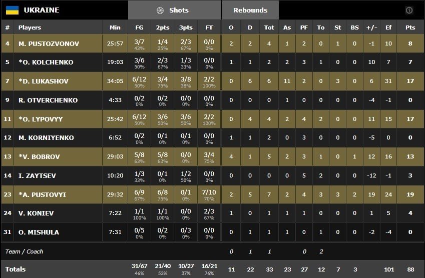 Le quatuor Pustovyi (19 points à 6/9 et 7 rebonds), Lypovyy (17 points à 6/9), Lukashov (17 points à 6/9, 6 rebonds et 11 passes) et Bobrov (13 points à 5/8) a été le grand artisan de ce succès. Les ukrainiens, dont les principales armes offensives sont absentes, ont mis pourtant en difficulté la défense géorgienne, pas au niveau. Le trio Pachulia (17 points à 4/8), Shengeila (16 points à 7/12 et 7 passes) et Shermadini (17 points à 4/8) n’a pas non plus réussi à faire la différence dans le money time.