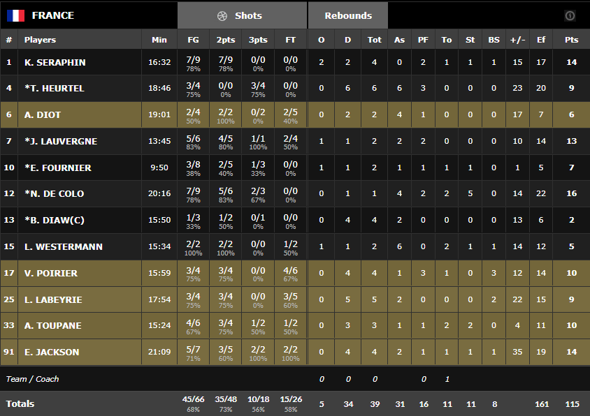 Nando de Colo termine avec 16 points à 7/9 et 5 interceptions, Edwin Jackson et Kevin Seraphin 14 points et Joffrey Lauvergne 13 points.