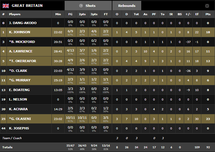 Porzingis avait donné le ton en inscrivant 7 points en 90 secondes et 12 des 14 premiers des siens. Malgré une grosse adresse extérieure des Lettons, la Grande-Bretagne s’est accrochée dans ce premier acte, conclu sur le score de 25-20. La Lettonie a littéralement pris feu à 3-pts sous l’impulsion de David Bertans, avec 5 3-pts de suite pour un 15-3 qui a fait passer le score à 48-34 et finalement 50-40 à la pause. Le festival extérieur s’est poursuivi en 3ème acte et la Grande-Bretagne a explosé, incapable de contenir le duo d’NBAers Porzingis – Bertans et l’écart a titillé les 30 points, 84-55 avant la fin du quart. En dernier acte l’écart a été réduit avec un 16-6 pour mettre la Team GB à 16 points, puis sur un dernier run, ils sont revenus à 6 points à 33 secondes du buzzer puis ont même eu un ballon dans les 15 dernières secondes pour revenir à une possession, mais trop tard.